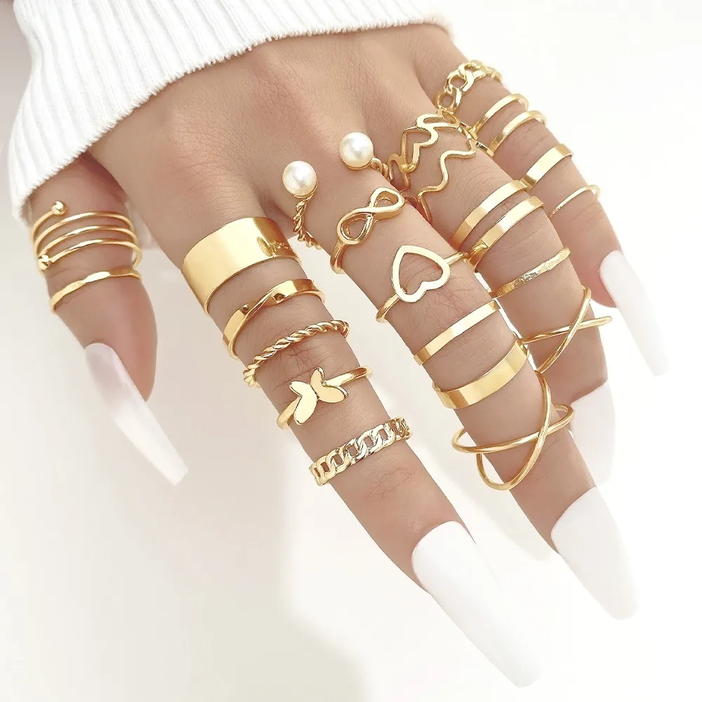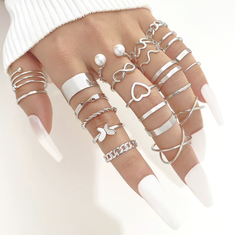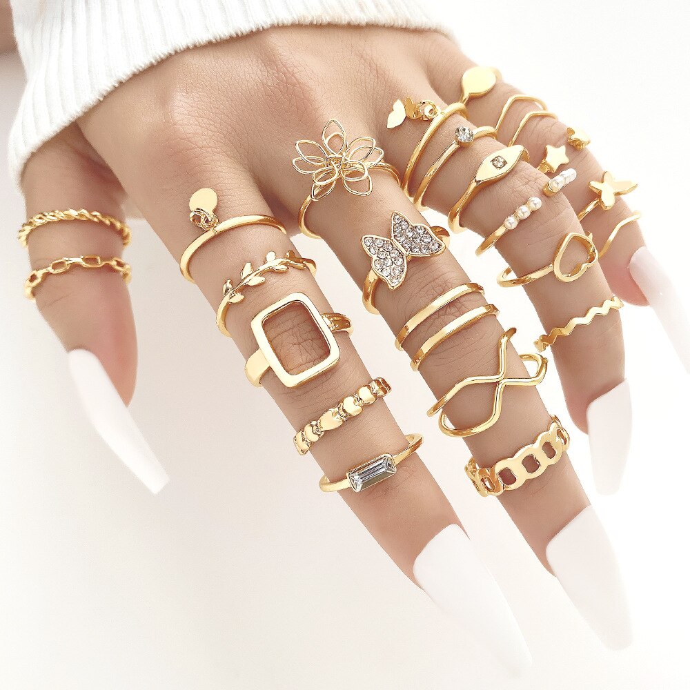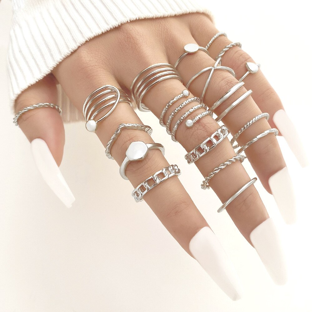 23pcs Set Vintage Hollowed Out Lotus Flower Rings Set for Women Metal Silver Color Geometric Spiral Shape Ring Trendy Jewelry