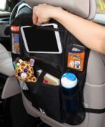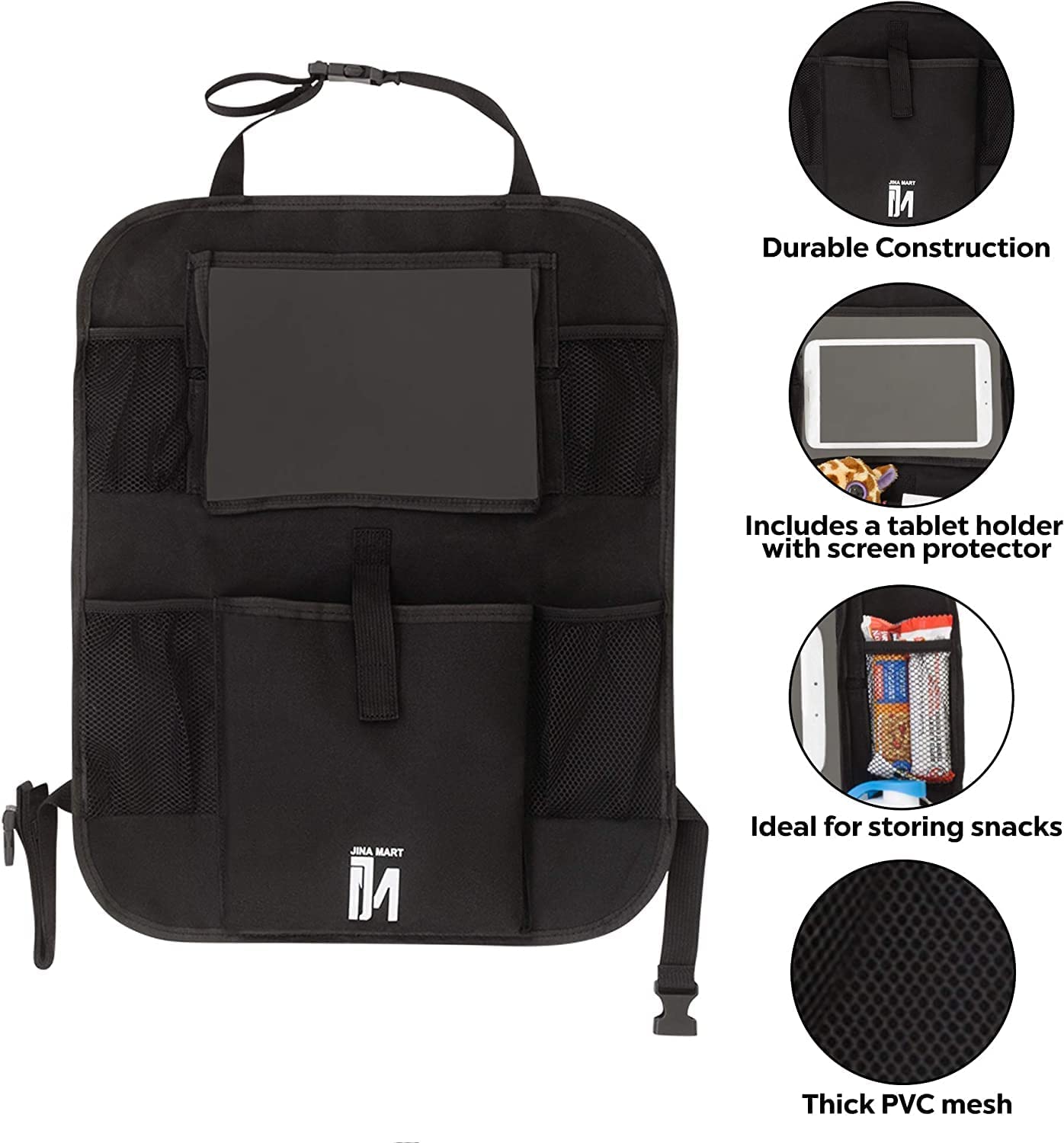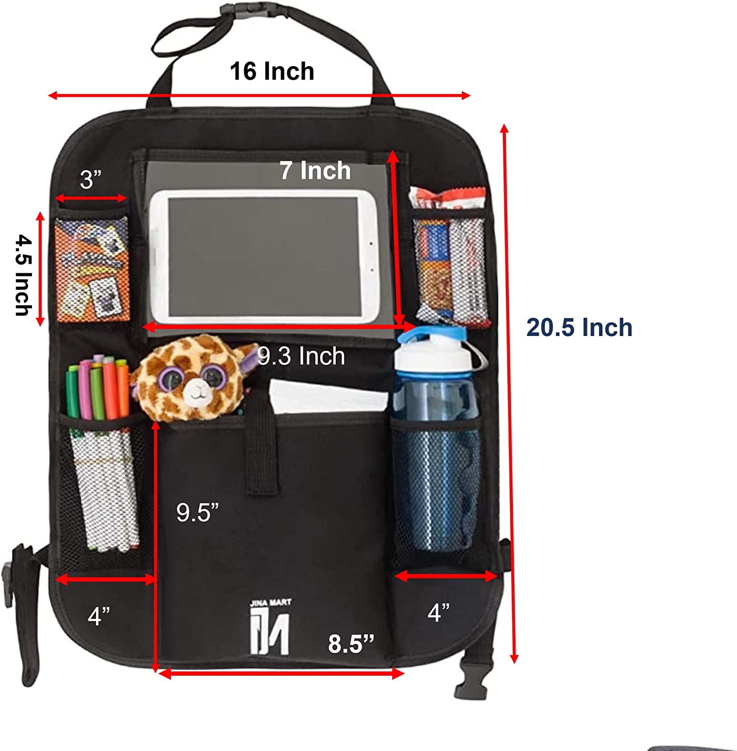 Jinamart car back seat organizer with 8 large compartments to store water bottles, chargers and earphones, toys and coloring books, snacks and diapers or pet supplies at your fingertips when traveling.